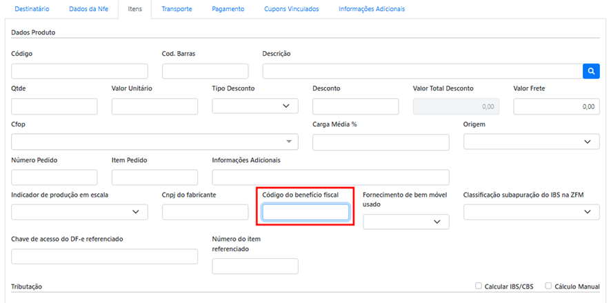 Durante o preenchimento da nota fiscal na aba de Itens, um pouco antes da parte de Tributação, temos que preencher o código cBenef que foi orientado pela contabilidade no seguinte campo: Código do benefício fiscal