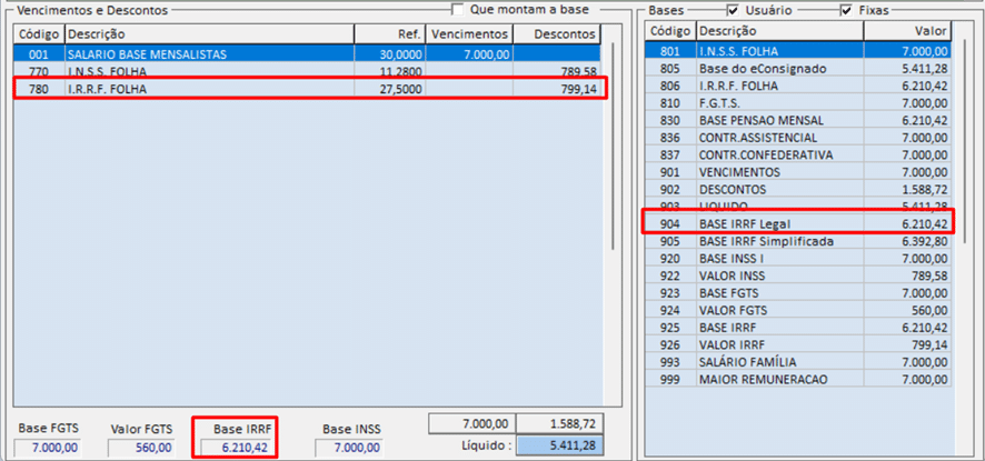 = R$ 6.210,42 Base de IRRF, o desconto seria de R$ 799,14. Iremos aplicar a fórmula para encontrar o valor do desconto do irrf = R$ 978,62 – (0,133145 x rendimentos tributáveis no mês)